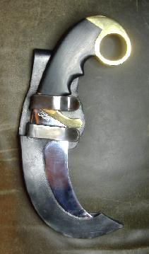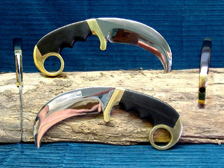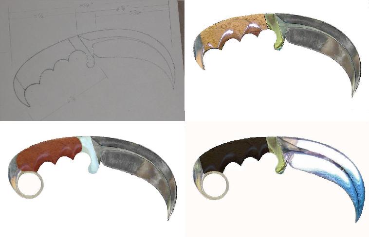 The design for the Black Knight went through several variations. Some with the finger loop, some without. Some in different combinations of materials, like the walnut and brass pictured above right or the final design in ebony and brass pictured lower right. We even played with details like the rounded corners where the guard and hilt join the wood, like in the bloodwood, bone and brass combination in the lower left rendering. As you might have guessed, designing a One Of A Kind can be exhausting. But, it's also highly rewarding and the only limitations are in the mind of the artist and client! As you can see, the art and the knife came out just about identical. Funny how that works! Even with hand forged.